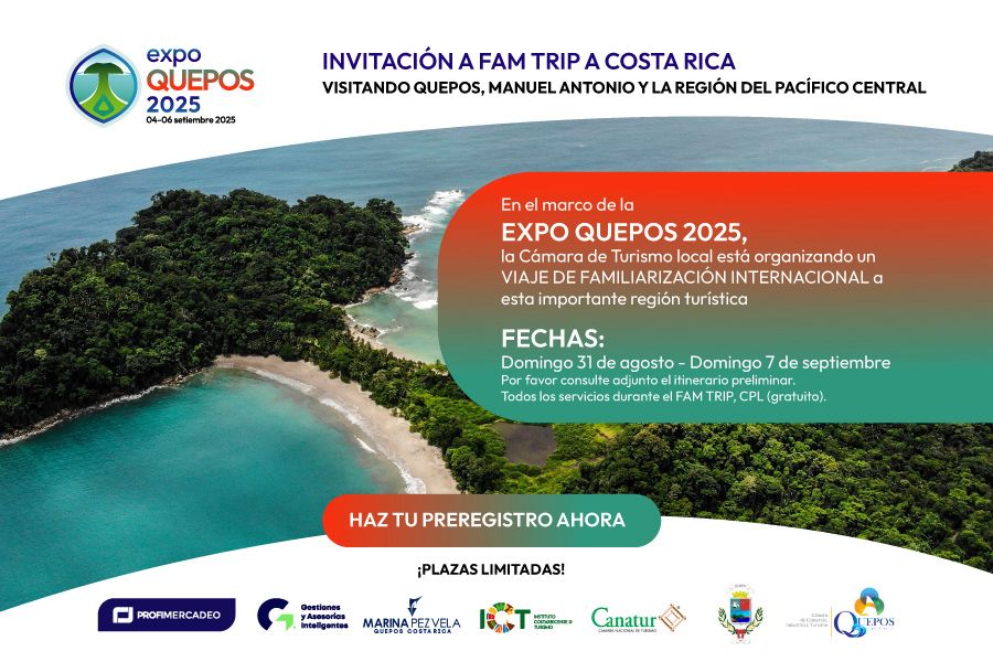 ¡Espacios limitados! Oportunidad única de visitar una de las regiones turísticas con mayor demanda y visitación y de interactuar con importantes proveedores, además de acompañarnos en la magna celebración del 30 aniversario de la Cámara de Comercio, Industria y Turismo de Quepos.